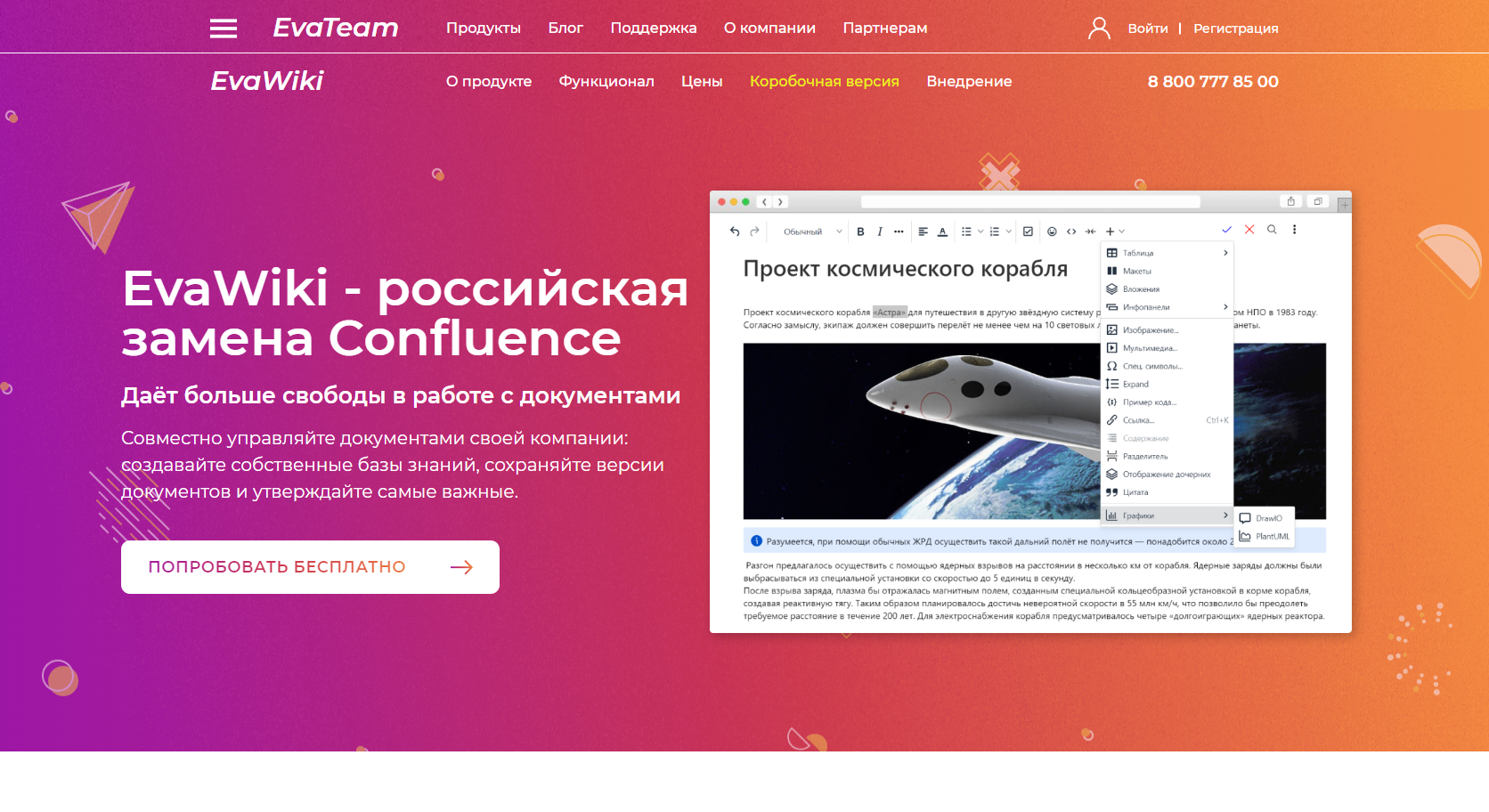 Пробную версию облачной версии EvaWiki можно создать на странице https://www.evateam.ru/evawiki/.