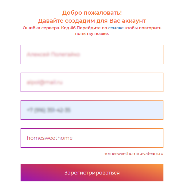 После заполнения всех полей и нажатия на кнопку "Зарегистрироваться" появится сообщение об ошибке сервера, но на самом деле, аккаунт будет создан. Перейдите по ссылке в верхнем сообщении, чтобы перейти в свой аккаунт.